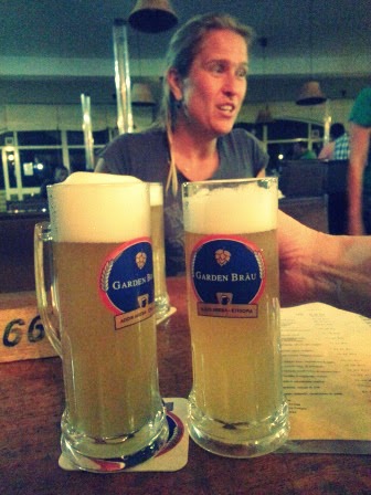 | Cheers! Trish and I met up with a volunteer (Trish's would-be roommate in Hossana) and a former volunteer (MD's, The Netherlands) at the hugely popular (to ferenji's at least) Beer Garden. |